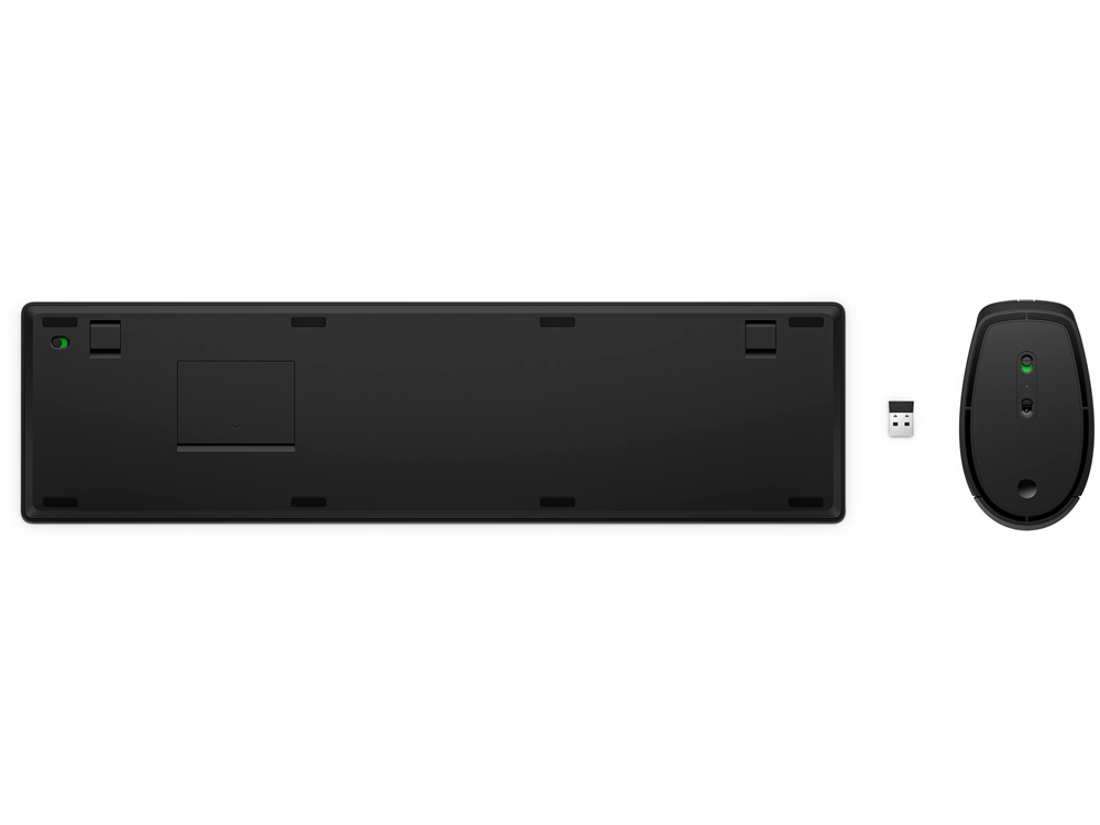 Wireless via USB dongle, QWERTY, Membrane keyboard, Mouse: optical, 3 buttons, ambidextrous