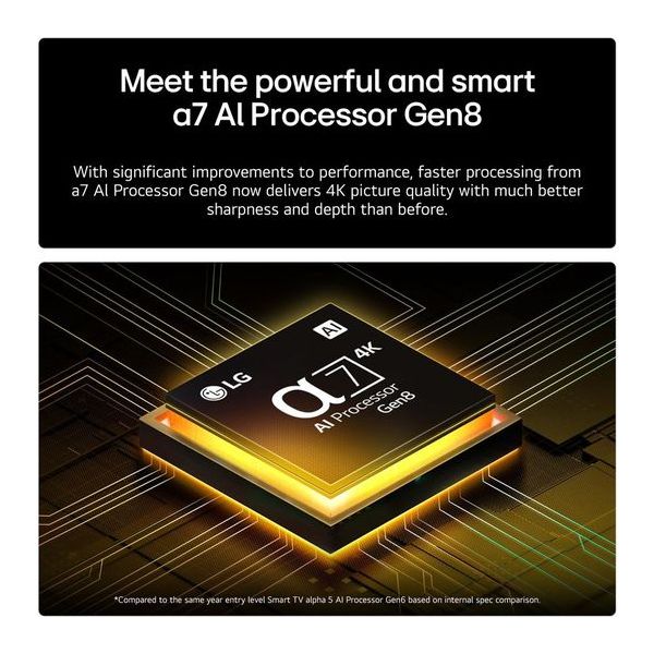 4K Ultra HD LED Display: Sharp 50-inch screen with 3840 x 2160 resolution • α7 AI Processor: Intelligent picture and sound optimisation • webOS Smart Platform: Access to Netflix, Disney+, Amazon Prime and more • FILMMAKER Mode & HDR: Cinema-quality viewing with HDR10 and HLG • Game Optimiser & ALLM: Responsive gaming with automatic low latency