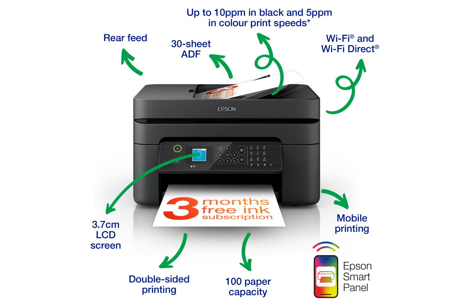 Epson WorkForce WF-2930 A4 Multifunction Wireless Inkjet printer with 3 months free ink* with ReadyPrint Flex subscription Ideal For Your Home Office This feature-rich...