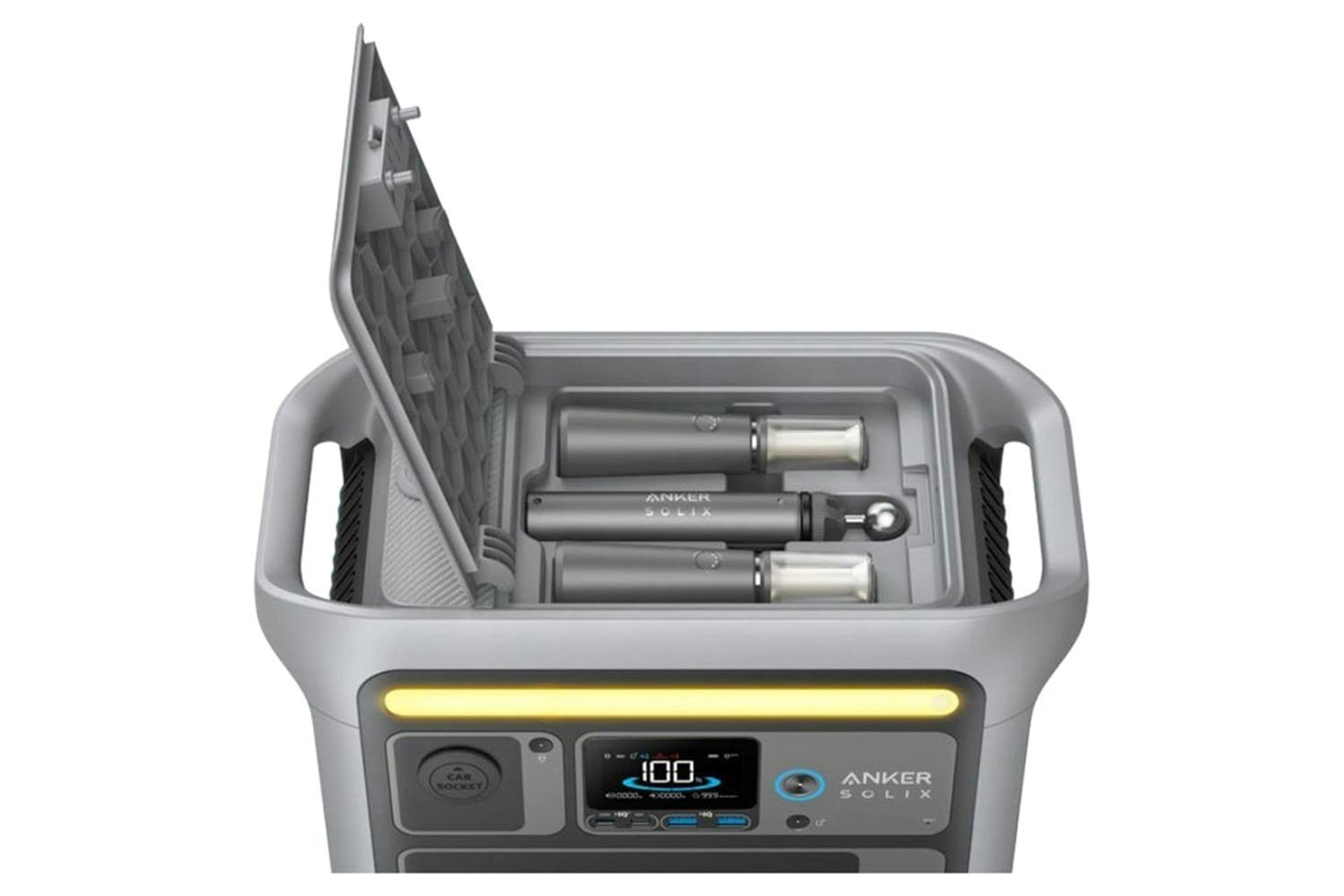 Built-in Camping Lights: Two detachable lights with three modes each • 58-Minute Fast Charging: Reaches 100% in under an hour with mains power • 1600W SurgePad Technology: Powers demanding appliances beyond rated capacity • 3,000 Cycle Battery: LiFePO4 technology lasts six times longer • 300W Solar Input: Charges to 80% in 2.3 hours with solar panels