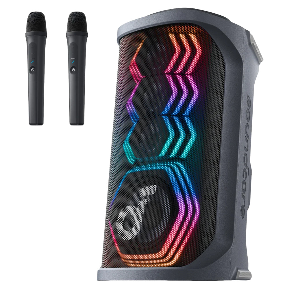 AI Vocal Removal: Trained on 20,000+ songs for custom karaoke • 200W Power Output: 108 dB audio fills large spaces • Dual Wireless Microphones: Included for instant karaoke fun • 12-Hour Battery Life: All-night entertainment capability • IPX4 Water-Resistant: Safe for outdoor pool and garden parties