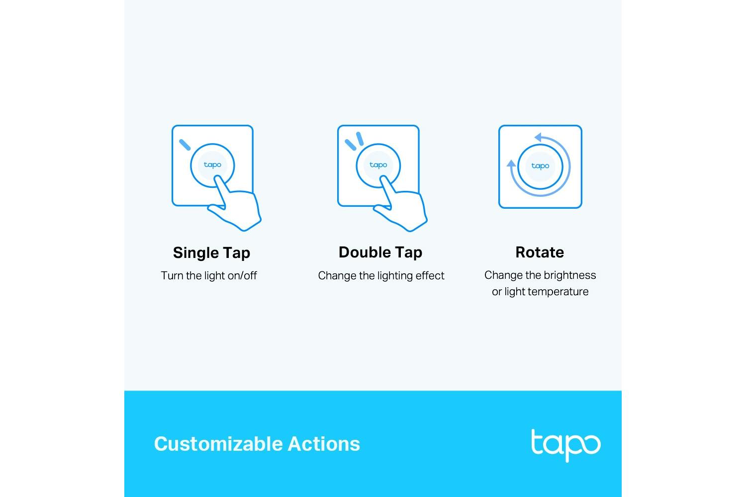 Smart Actions: Control multiple Tapo smart devices. • Local Instant Control: App-free control with smart remote dimmer. • Multi-Location Control: Control lights from various locations. • Customized Actions: Single tap, double tap, and rotating options.