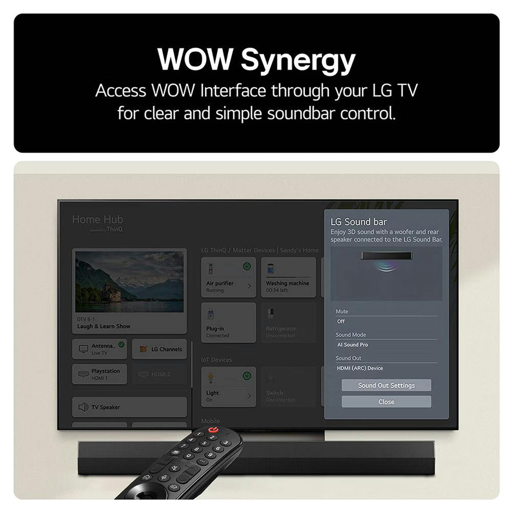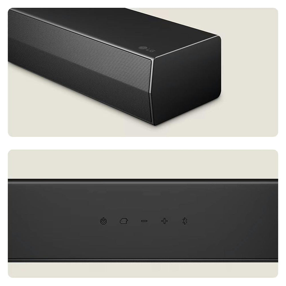 Compact design fits neatly beneath most TVs at just 650 mm wide • 50 W stereo output with dedicated woofers, tweeters and passive radiators • AI Sound Pro automatically optimises audio settings for any content type • WOW Interface for seamless control through compatible LG TVs • Bluetooth 5.3 for wireless streaming from smartphones and tablets