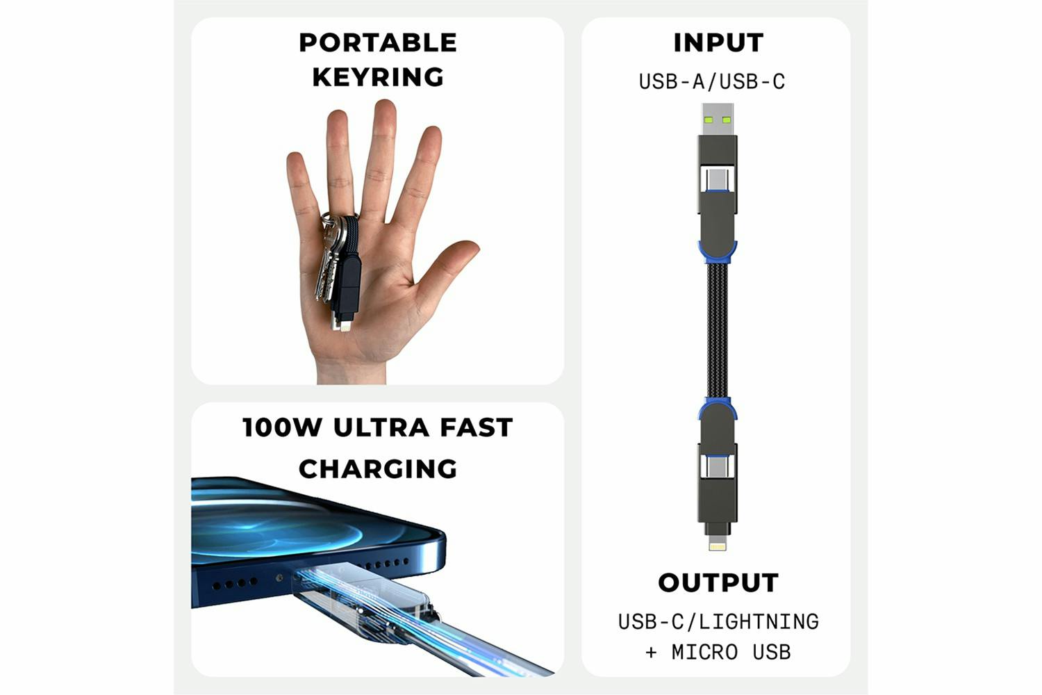 6-in-1 Charging Cable With 100W • Data Transfer & Ultra-Fast Charging up to 100W & Apple's Fast Charging up to 18W. • 6 different combinations that can virtually charge any device from any power source. • Compatibility with iPhone, iPad, iPod ,Laptop, tablets, Type-C devices & MicroUSB devices